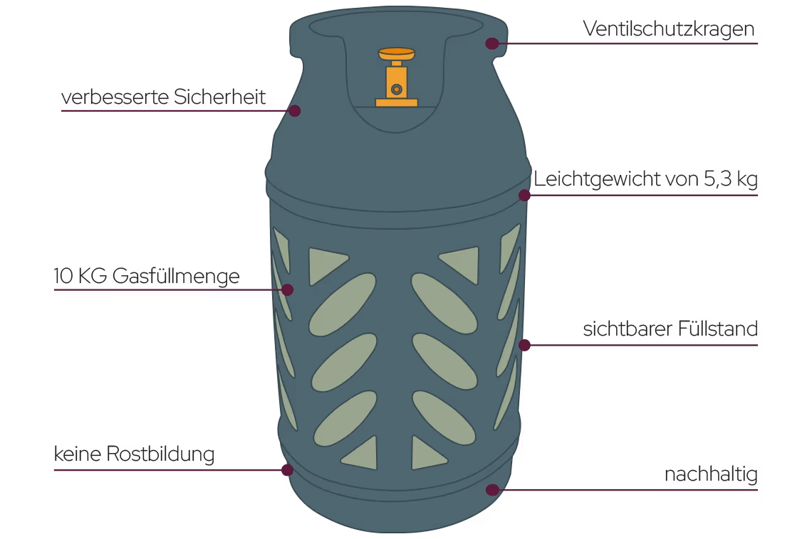 Die neue Composite Gasflasche kann mit 10kg Propangas gefüllt werden.